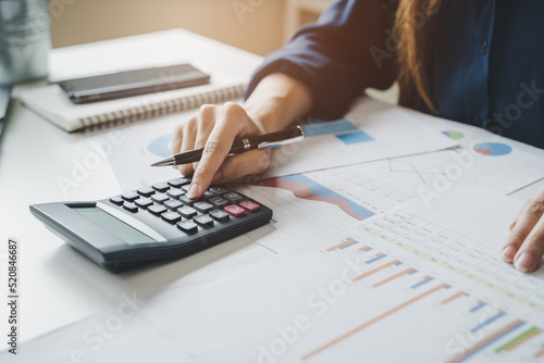 Women business people use calculators to calculate the company budget and income reports on the desk in the office.