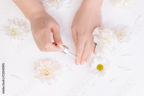 Women hands hold pipette with cosmetic serum on white background with flowers, top view. Organic oil for health of nail and skincare concept