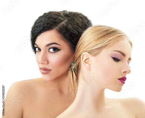 Women in love. Caucasian blond girl and beautiful young girls posing in studio over white background. Fashion, beauty, glam, youth. Makeup. Double female portrait. Homosexual relationship