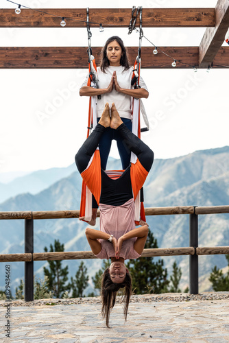 woman, meditating, practicing, aerial, yoga, hanging, silk, three, 2, people, sport, adult, group, man, male, outdoors, healthy, lifestyle, health, acrobatic, acrobat, artist, active, athleticism, self, improvement, class, relaxation, exercise, closed, eye, prayer, pose, mindfulness, mid, pair, balance, flexibility, togetherness, caucasian, exercising, meditation, lifestyle, well-being, upside, down, female, young