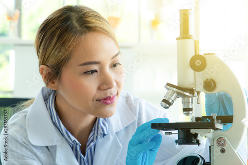 Women scientist research and looking microscope in a laboratory. Health care scientific experiment working in lab