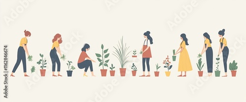 woman, plant, gardening, pot, flower, leaf, green, dirtied, care, growth, nature, spring, summer, hobby, lifestyle, activity, people, female, group, team, together, healthy, happy, home, decor, indoor, planting, transplanting, nurturing, cultivating, blossom, bloom, foliage, vibrant, colourful, illustration, design, graphic, art