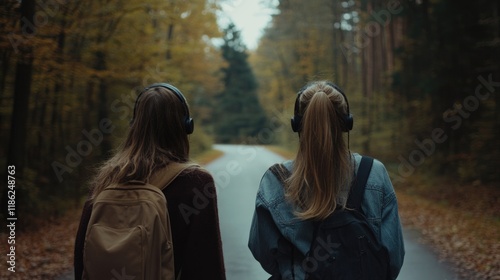 Women walking on a forest road with autumn foliage, wearing headphones, enjoying music, and showcasing empty space for text in a tranquil setting