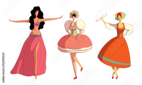 woman, wearing, dress, perform, different, dance, set, variation, folk, dancing, dancer, illustration, belly dance, russian, isolated, graceful, performer, national, female, flexibility, posing, traditional, studio, elegance, action, ethnic, costume, active, art, artist, contemporary, exercise, lady, dressed, carnival, international, culture, festival, entertainment, composite, compilation, artwork, activity, vector
