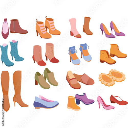 textile, trendy, accessory, illustration, colourful, modern, vector, shoe, casual attire, variety, footwear, design, boot, shoe, clothing, footgear, elegant, fashion, apparel, fabric, stylish, pump, flats, high heel, style