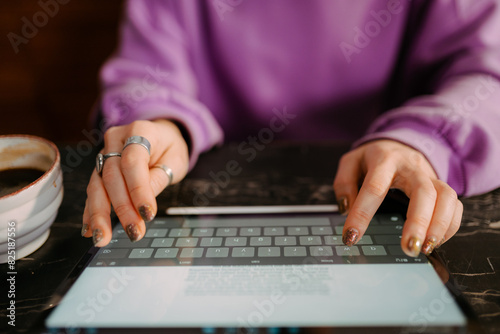 anonymous, body part, cafes, closeup, hot drink, cup, hand, indoor, to sit, table, tablet, texting, typing, unrecognizable, use, work