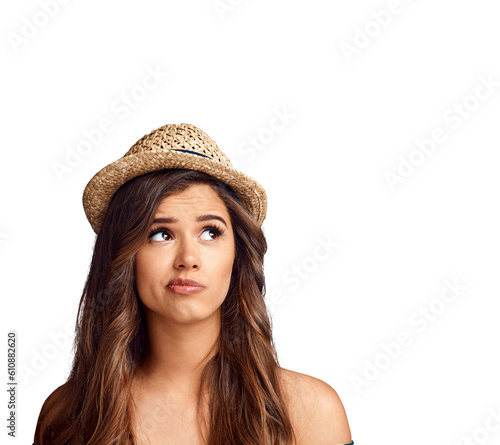 Wonder, confused and young woman with a thinking, dreaming or thoughtful facial expression. Decision, hat and female model with question or contemplating face isolated by transparent png background.
