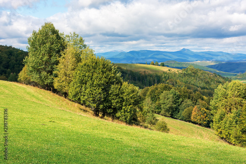 wonderful countryside in mountains on a sunny day. trees on the grassy hillside meadow. distant ridge with high peak beneath a cloudy sky. beautiful landscape of ukrainian carpathians