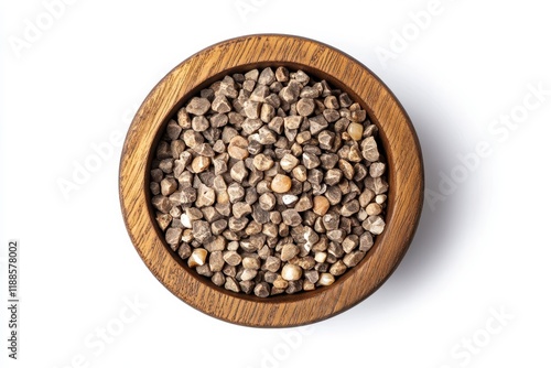 Wood bowl containing Job s tears viewed from above on a white background