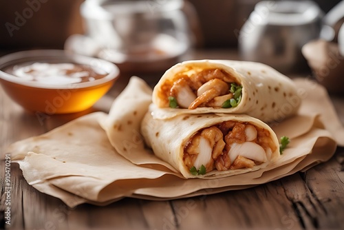 chicken, slice, tortilla, enclosed, wood, food, meal, tasty, eating, drinking, bread, plate, breakfast, snack, battercake, meat, dish, dinner, lunch, cookery, delicious, sweet, dessert, white, epicure, fresh, fried, cake, sauce, sandwich