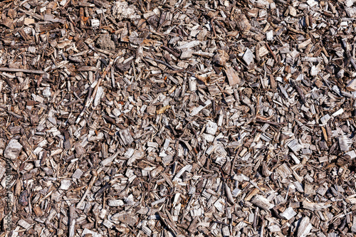 Wood chip bark chippings having been shredded for use as a garden mulch by the lumber timber industry which can be used as an abstract texture background, stock photo image