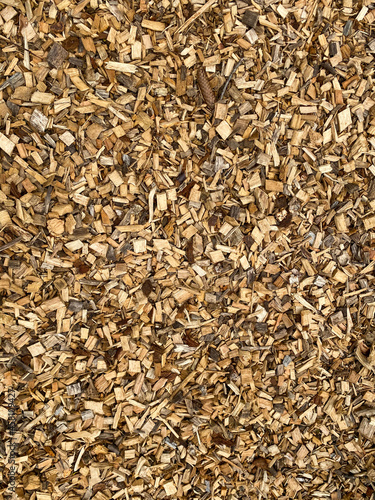 Wood chips on the ground makes a cool industrial pattern background. Yellow and brown colored. Vertical.