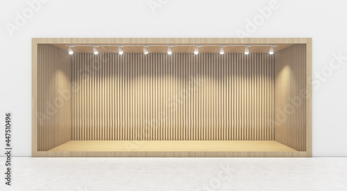 wood shop window display, Empty storefront, Showcase on the street. mock up 3D render