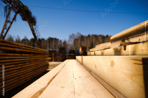 Wood timber in the sawmill. Piles of wooden boards in the sawmill.