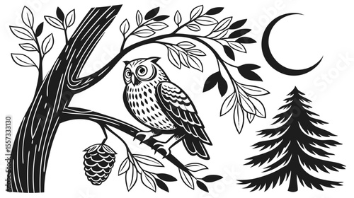 Woodcut Owl Illustration — Black and White Vintage Nature Art with Moon and Leaves