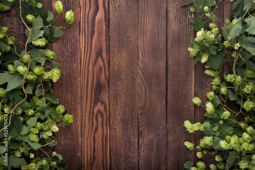 Wooden background. Frame of green hops on rustic old wooden boards. Copy space.