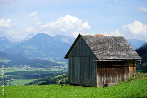 farm, house, wooden, green, grass, view, mountain, nature, vale, cloud, sky, barn, shed