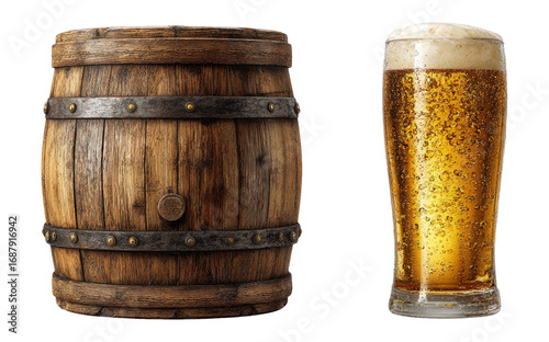 Wooden Barrel and Glass of Beer Isolated on Transparent Background