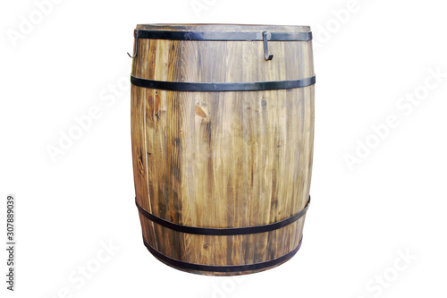 Wooden Barrel With Black Iron Straps Isolated on White Background with Clipping Path