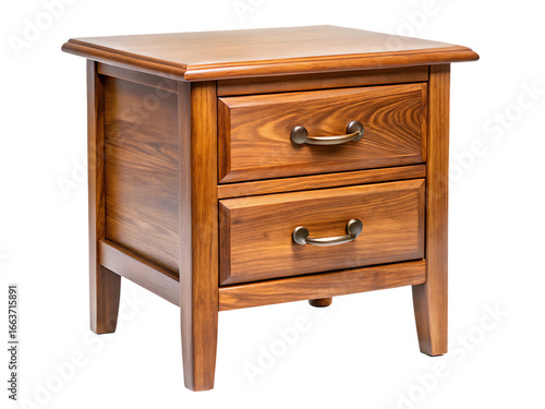 Wooden bedside table with two drawers and metal handles nightstand furniture isolated on a transparent background