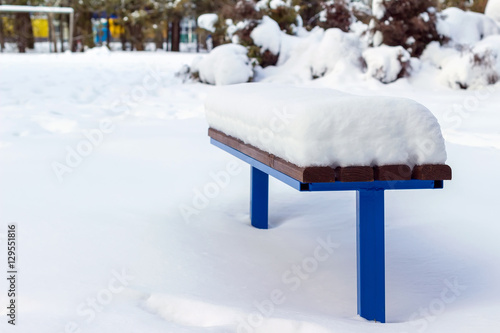Wooden bench covered by snow in winter day.