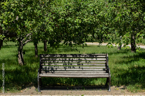 wooden bench in a large garden
