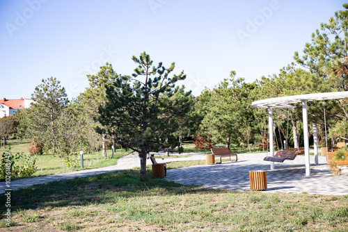 Wooden bench in the park on a background of the blue sky in the walnut grove of Anapa in summer