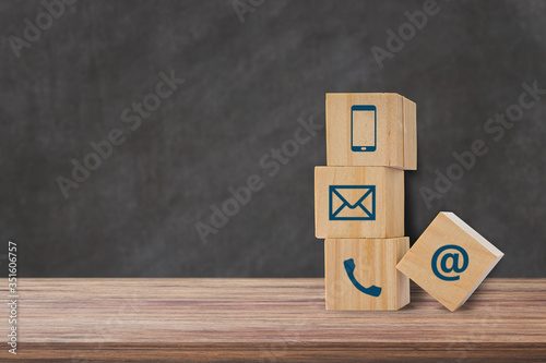 wooden block cube with (telephone, email, address) icon. Concept of contact us or customer support theme.