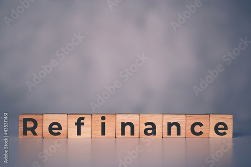Wooden block with refinance word about home and finance, loan and mortgage for real estate and property, residential and planning with budget, nobody, investment and earning, business concept.