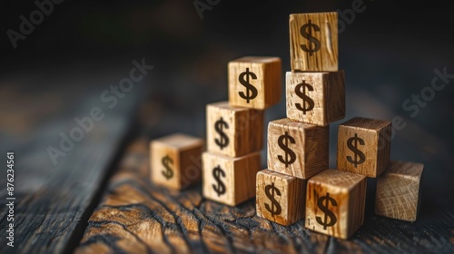 wooden, block, displaying, currency, symbol, upward, trend, black, background, illustrating, financial, growth, profit, increase, flat, lay, high, quality, abstract, design