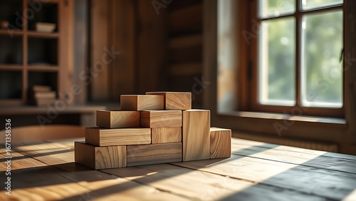 Wooden blocks forming an abstract staircase bathed in warm morning sunlight.