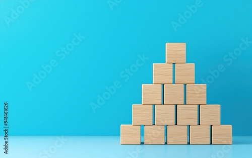 Wooden blocks pyramid on a blue background symbolizing structure, balance, and growth. Perfect for business, education, and growth concepts.