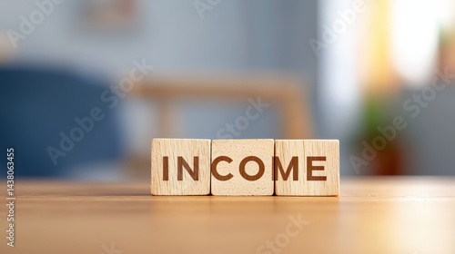Wooden blocks spelling "INCOME" on a table, with a blurred indoor background.