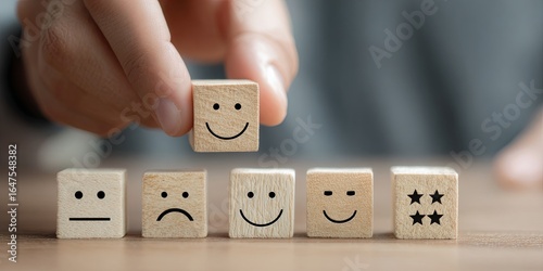 Wooden blocks with expressive faces representing emotions, happiness, and satisfaction in a creative setup for storytelling and communication
