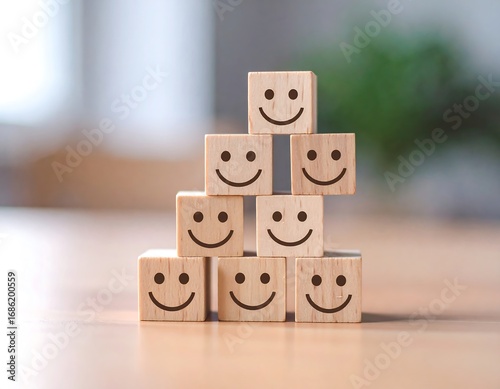 block, wooden, happy, face, smile, pyramid, stack, positive, feedback, satisfaction, success, growth, achievement, motivation, client, service, business, teamwork, support, building, organisation, upward, progress, strategy, goal, quality
