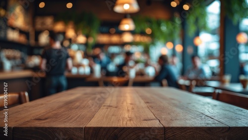 Wooden board empty tabletop in blurred surroundings. Perspective brown wood table set against a coffee shop backdrop.