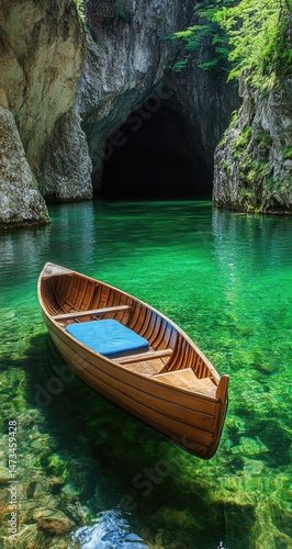 Wooden boat in crystal-clear, emerald-green lake, leading to a dark cave
