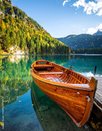Wooden boat on a serene lake surrounded by autumnal mountains