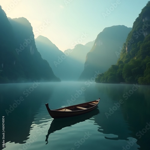 Wooden Boat on Calm Lake at Sunrise with Misty Mountains