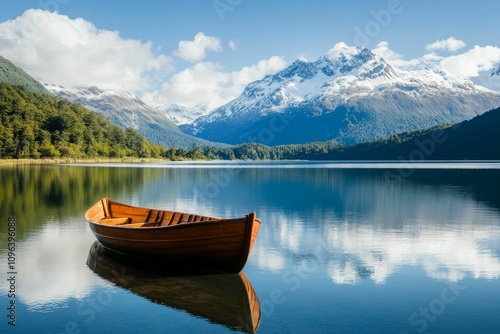lake, calm, water, boat, wooden, dinghy, mountain, snow, peak, cloud, sky, blue, serenity, peaceful, nature, landscape, scenery, stillness, calmness, majestic, beauty, wilderness, outdoors, scenic, travel, adventure, holiday, relaxation, remote