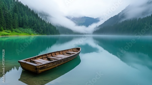 Wooden Boat Resting on a Calm Lake near Misty Mountains