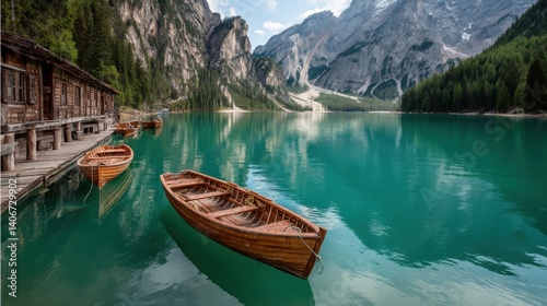 Wooden boats rest peacefully on a stunning turquoise lake. Majestic mountains loom in the background, while a rustic wooden structure sits nearby