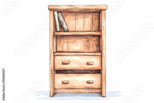 Wooden bookshelf with two drawers and three shelves, designed for home decor and organization in a cozy environment