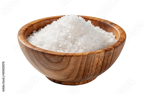 Wooden bowl filled with coarse sea salt granules for culinary use and natural seasoning supplies