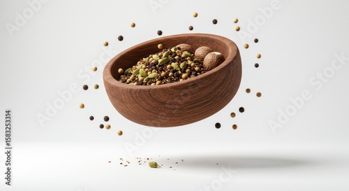 bowl, wooden, spice, mixed, herb, nut, peppercorn, floating, food, epicure, aromatic, colourful, texture, favor, ingredient, kitchen, culinary, design, mix, spice, ground, whole, fresh, natural, healthy, organic, aroma, alimentary, variety, blend, cooking, receipe, preparation, ingredient, presentation, three-dimensional, render, studio, white, background, levitation, geometric, minimalist, modern