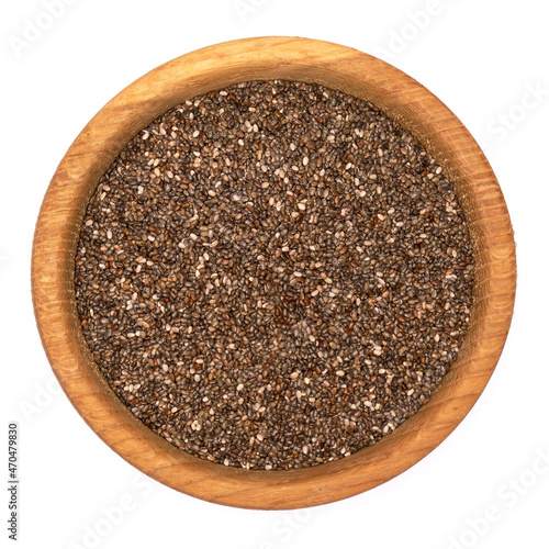 Wooden bowl of organic natural chia seeds close-up isolated