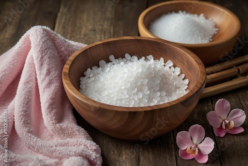 Wooden Bowl with White Bath Salt and White Towels on a Wooden Table