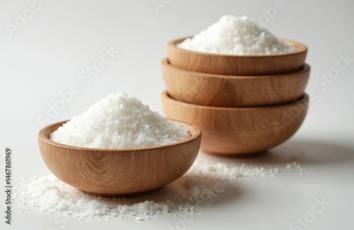 Wooden bowls filled with white sugar on white background. Kitchen utensils. Product photo for cooking or serving. Minimal design, natural light. Food ingredient concept.