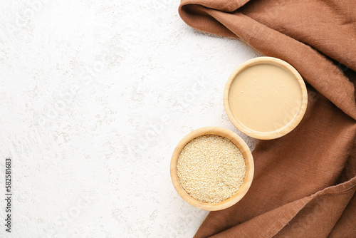 Wooden bowls with tasty tahini and sesame seeds on light background