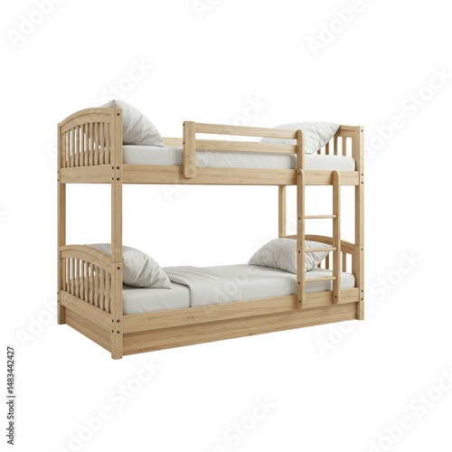 bed, bunk, furniture, wooden, bedchamber, interior, ladder, mattress, pillow, home, sleep, frame, design, comfort, apartment, contemporary, modern, style, nobody, object, with, white, sheet, isolated, transparent, background, feature, access, ideal